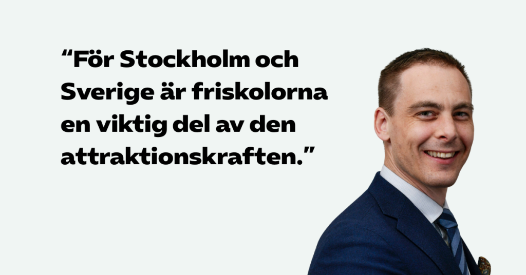 – Vi vet att skolor med hög kvalitet är en avgörande faktor för att attrahera talanger och arbetskraft till regioner och städer. För Stockholm och Sverige är friskolorna en viktig del av den attraktionskraften, säger Christoffer Hökmark, skolpolitisk expert för Almega Utbildning.